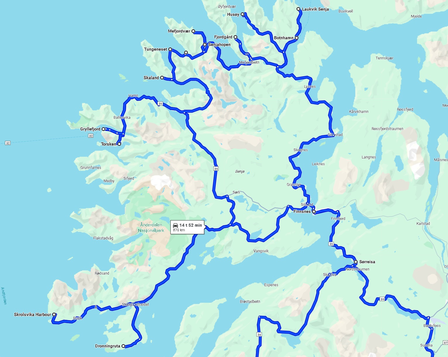 Vi kjørte E10 til Bjerkvik og E6 videre nordover. Stoppet kort på Polarpark, men med inngangsbillett på 385,- pr. pers. valgte vi lett å kjøre videre. Handlet lunsj på Domus Setermoen og satte oss på en benk rett ved. Etter lunsj kjørte vi E6 videre til Bardufoss og tok av på 86 mot Sørreisa. Handlet på Rema 1000 i Finnsnes før vi kjørte over Gisundbrua til fastlands-Norges nest største øy, Senja. Fortsatte videre sørover til Stonglandet og gikk Dronningruta til det sydligste punktet av Senja. Det regnet litt så vi ble bløte. Kjørte deretter rett til huset vi hadde leid i Skrolsvika. Adressen var Vasskråa 29, 9392 Stonglandseidet. Utleier var Svein-Kyrre Ludviksen. Stekte oss Grandiosa og så på film. Jeg måtte legge inn årene halv elleve. Var så trøtt at jeg ikke fikk pusset tennene heller.