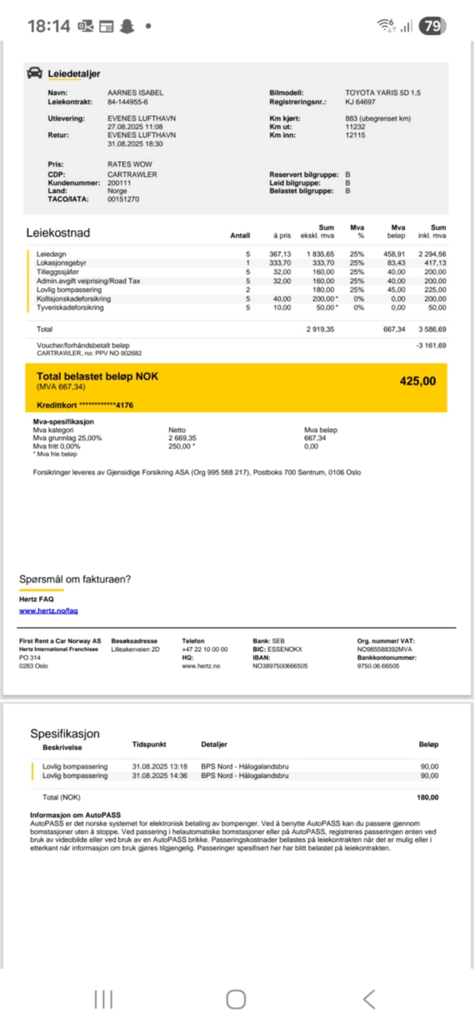 Sto opp 05:00 etter ganske dårlig søvn. La meg ikke før ett heller. Men fikk pakket ferdig og gikk ned til togstasjonen. 06:20 gikk toget fra Hamar stasjon. Anne og Eirin skulle på områdesamling i Kristiansand så jeg tok følge med dem til Gardermoen. Der møtte jeg Isabel Aarnes og vi fikk skrevet ut bagasjelapper og kommet oss gjennom sikkerhetskontrollen. Flyturen gikk uten problemer og 10:35 landet vi på Evenes. Bagasjen kom raskt. Var litt kø foran Hertz bilutleie. Men vi fikk bilen, en Toyota Yaris 2025.