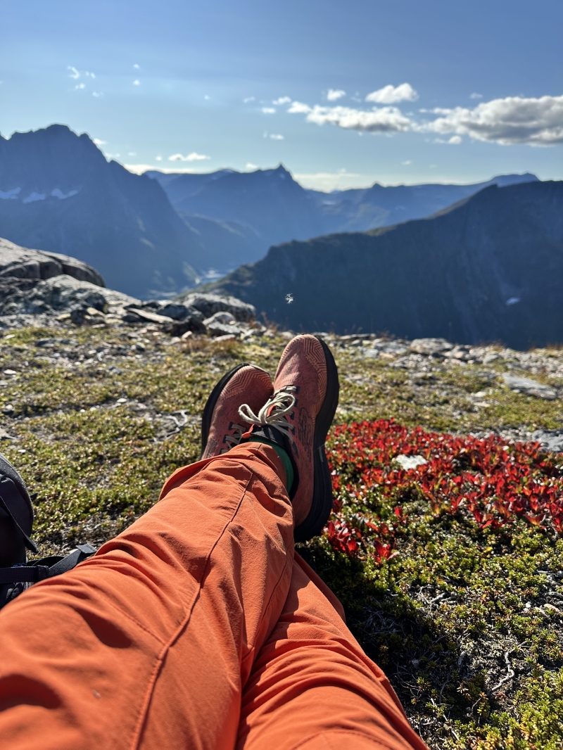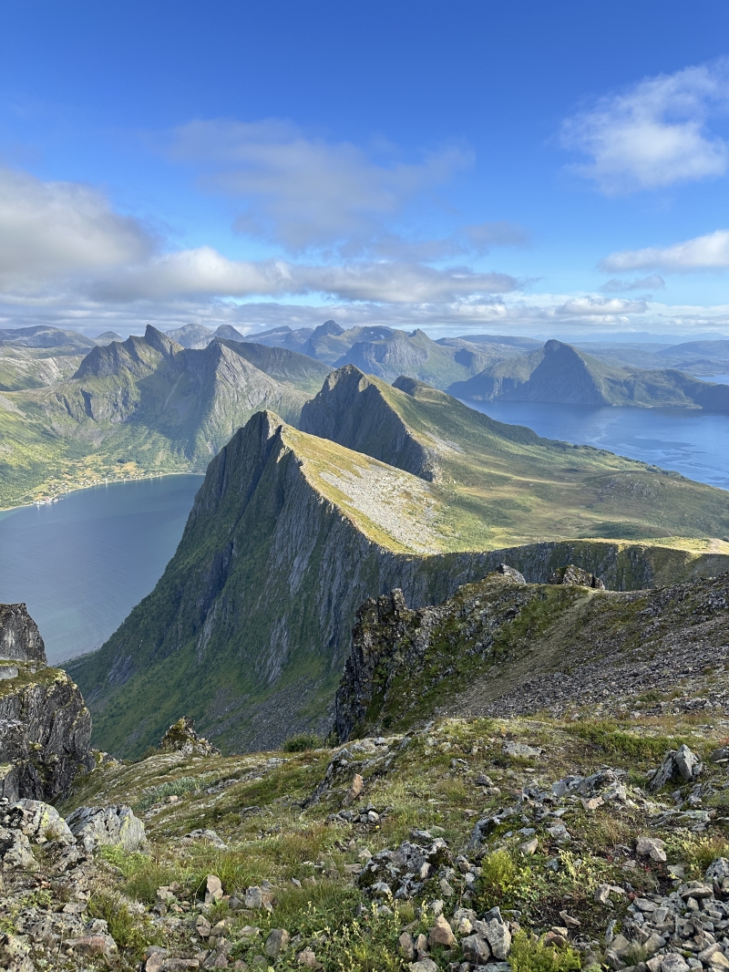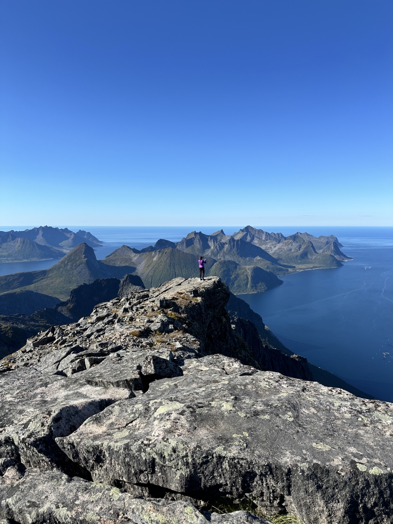 Tok på meg ryggsekken og gikk oppover til et punkt hvor man må velge å gå til Hesten eller Segla. De lokale kaller det Sinsenkrysset. Vi skulle jo uansett gå begge så litt tilfeldig valgte vi Segla først. Kom ganske snart til noe som ble kaldt Brorbua. Han som hadde bygd bua med kone satt der akkurat da, så det ble en hyggelig prat med dem. Vi fortsatt så videre et stykke på tilrettelagte planker før vi kom til løvskog og bratt stigning. Kom så til en liten toppflate kalt Heia hvor vi begynte på den siste, lange, bratte stigningen til Segla. Været var nydelig hele tiden. Fantastisk utsikt på toppen. Etter litt bildetakning og en pause ruslet vi ned igjen til Sinsenkrysset og valgte ruta opp til Hesten. Denne var lettere og mer folksom. Det tok ikke lang tid før vi var på toppen og hadde fantastisk utsikt mot Segla som vi var på for noen timer siden. På andre siden hadde vi like nydelig utsikt mot Inste Kongen og Svartvasstinden. Etter at bildene var tatt ruslet vi raskt ned igjen til bilen svært fornøyde etter en fantastisk tur.